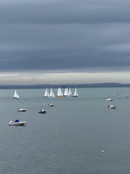 With the wonderful safety boat team at SVYC ferrying the Livery teams out to their boats very quickly, the first task for the spectators was to work out which Livery was in which colour boat – we were glad of the race team’s cheat sheet! The SVYC Mermaids are fantastic boats, all with a different colour hulls and a matching ‘big’ spinnakers which were quite the sight during the racing. As the crews milled around the start line, getting used to the boats, locating the marks, and taking transits, we were greeted by 2 glorious Spitfires flying overhead to welcome in the racing, almost as though it was organised!